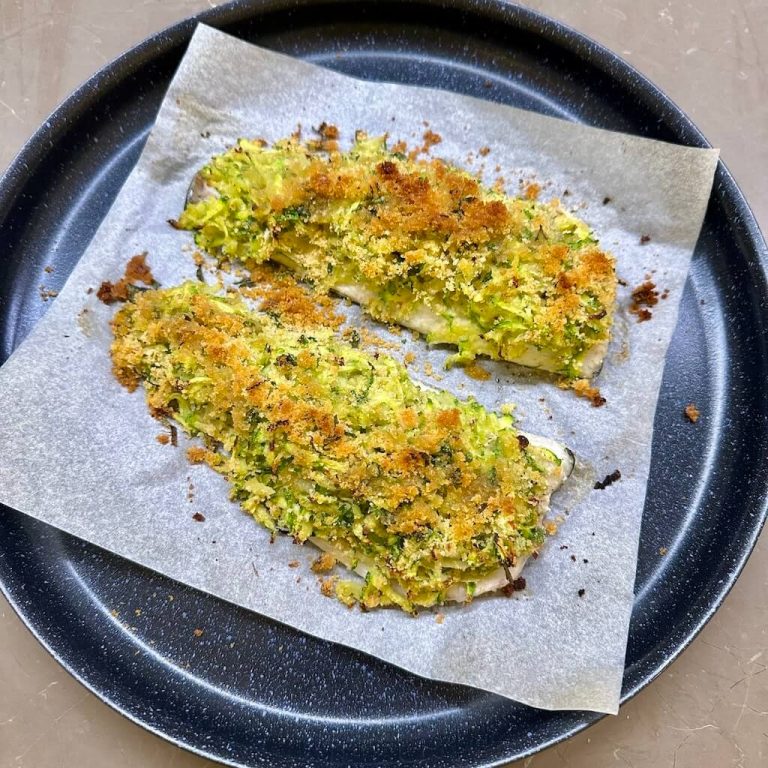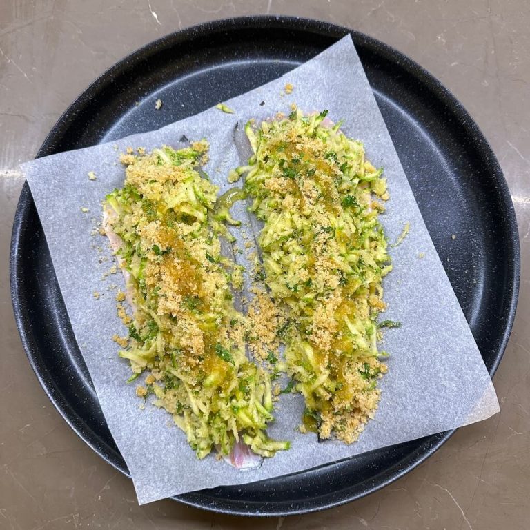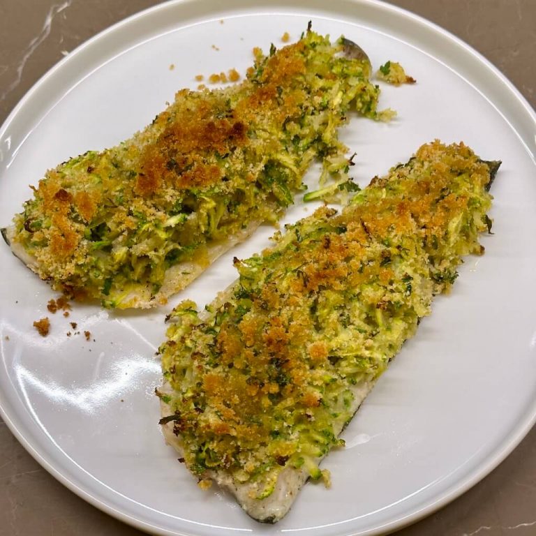 Le patate e zucchine grattugiate distribuire sul pesce insieme a un po’ di pangrattato aromatizzato (con olio, aglio, prezzemolo, sale e pepe), formano una crosticina dorata e delicata che rende questo piatto non solo delizioso, ma anche bello da vedere.