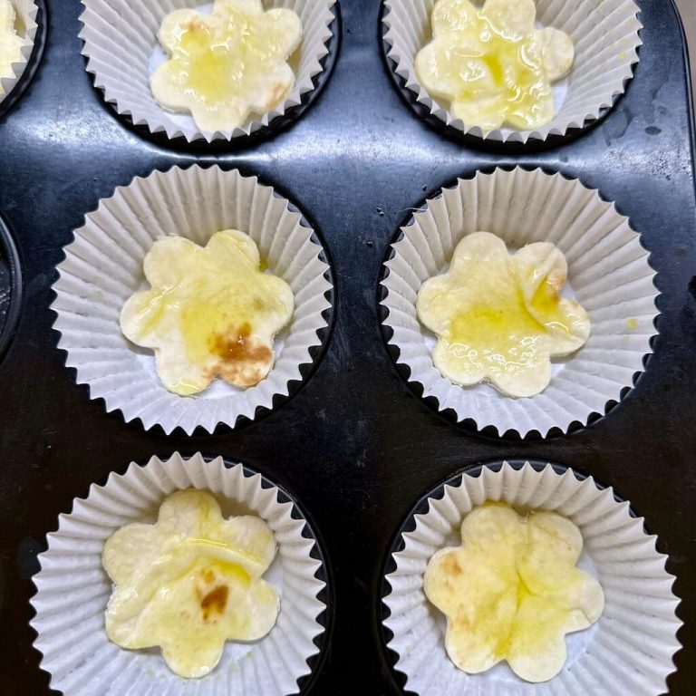 Spennellare con un goccio d’olio e cuocere in forno, in uno stampo per muffin, a 200gradi per 7-10 minuti circa fino a quando la piadina risulterà dorata.