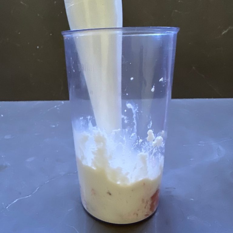 Nel frattempo frullare con un mixer: 60gr di salmone affumicato, 100gr di ricotta e panna.