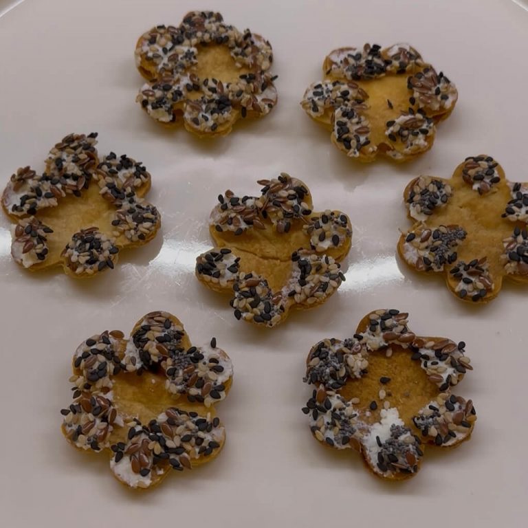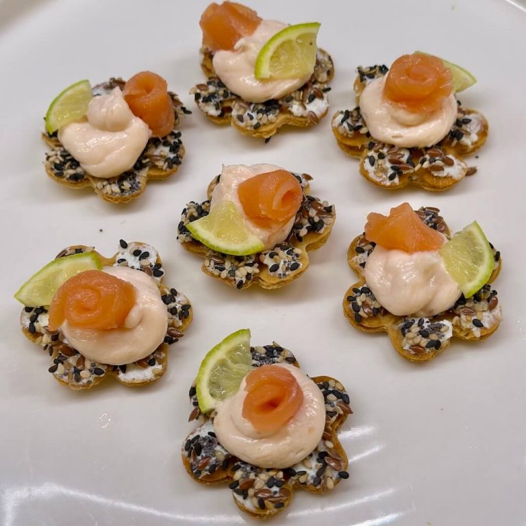 Per renderli ancora più belli e colorati ho usato un mix di semini sui bordi e fettine di lime e roselline di salmone affumicato (realizzate semplicemente arrotolando delle fettine di salmone).