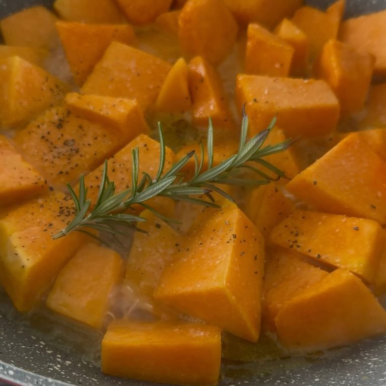 Tagliare la zucca a cubetti piccoli e spadellarla in padella con un filo d’olio, un rametto di rosmarino, sale, pepe e mezzo bicchiere d’acqua. Cuocere finché diventa morbida e dorata (circa 10-12 minuti).