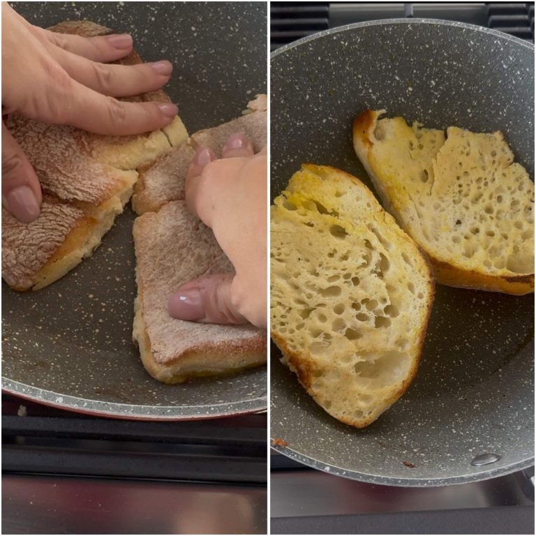 Nella stessa padella della zucca tostare le fette di pane da entrambi i lati finché risultano croccanti all’esterno ma ancora morbide dentro.