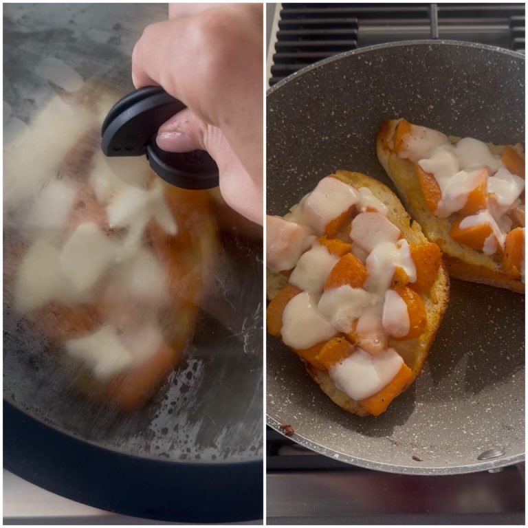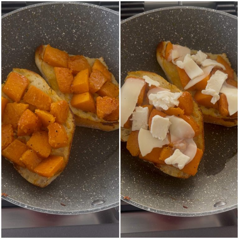 Si parte da una base di pane rustico, croccante fuori e morbido dentro, quello che profuma di forno e fa subito casa. Sopra, una generosa dose di zucca spadellata con olio e rosmarino, dolce e profumata, che si scioglie in bocca. Poi il taleggio (o la provola, se amate il gusto più deciso), che diventa filante e cremoso, pronto ad avvolgere ogni pezzetto di zucca in un abbraccio goloso.