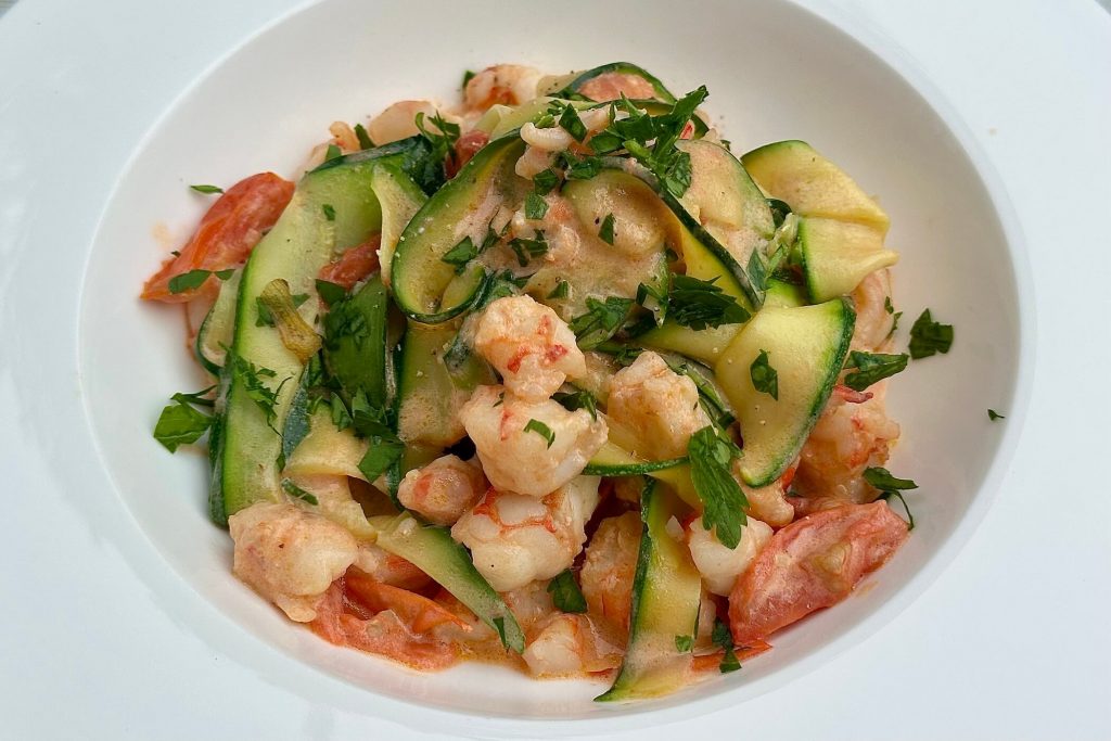 Dopodiché si prepara un sughetto a base di pomodorini e gamberi e una volta pronto si aggiungono semplicemente le finte tagliatelle di zucchine, si prosegue la cottura per qualche minuto fino a quando si saranno ammorbidite e poi si manteca il tutto con un po’ di formaggio spalmabile per rendere il sughetto cremoso.