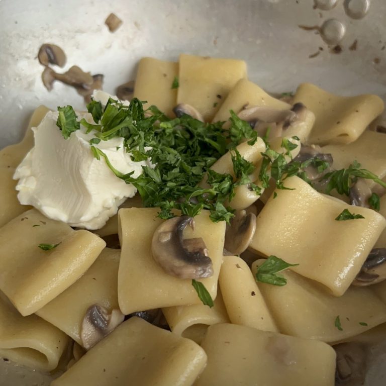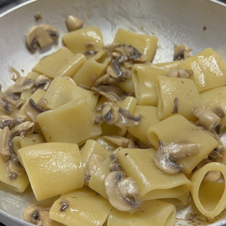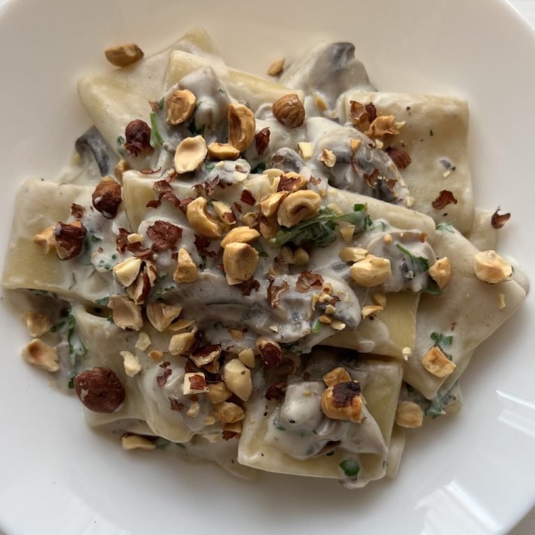 La pasta funghi e nocciole è un abbraccio caldo nei giorni in cui l’aria si fa fresca. I funghi sprigionano tutto il loro profumo boschivo, le nocciole regalano croccantezza e la robiola lega ogni boccone con la sua cremosità avvolgente. È un primo piatto semplice, ma con un’eleganza naturale — di quelli che sanno trasformare una cena qualsiasi in un momento di puro comfort.