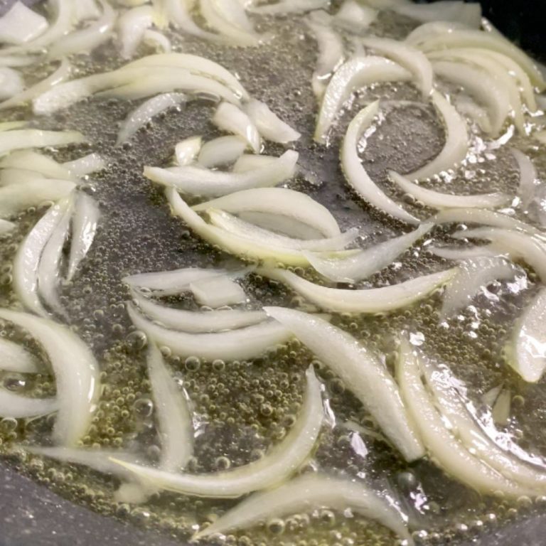 Ora metti un bel giro d’olio in padella, aggiungi la cipolla tagliata grossolanamente e lasciala stufare con un goccio d’acqua.