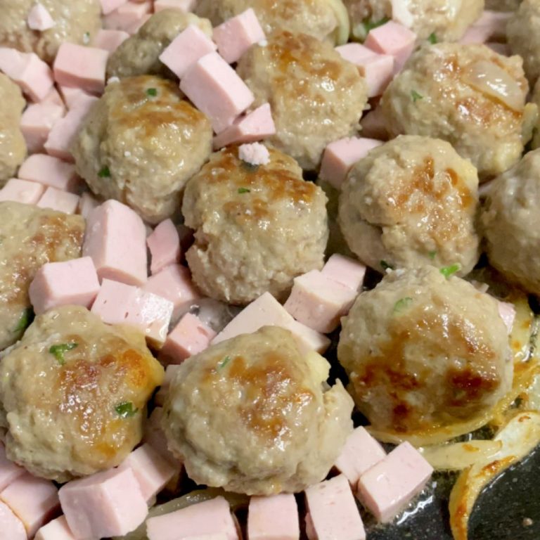 Si comincia dall’impasto delle polpette, semplice, fatto bene, di quelli che profumano già prima di cuocere. In padella si stufa piano la cipolla, senza fretta, finché diventa morbida. Poi entrano in scena le polpette, che si fanno rosolare e prendono colore, quel bel colore che ti fa salire l’acquolina a livelli altissimi. A questo punto si aggiunge prosciutto cotto o pancetta, esattamente come nelle penne al baffo.