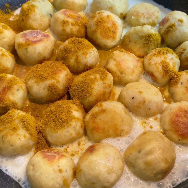 Un piccolo accorgimento può davvero fare la differenza: inumidisci leggermente le mani mentre formi le polpette. Questo semplice gesto ti aiuterà a lavorare meglio l’impasto, evitando che si attacchi ai palmi e rendendo le polpette al curry più uniformi e compatte. Dopo averle passate nella farina, falle rosolare in padella con un bel giro d’olio fino a doratura completa.