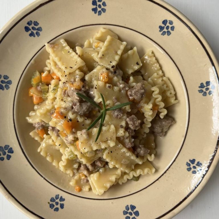 Rispetto al classico ragù alla bolognese, questa versione “in bianco” ha un’anima più rustica, più diretta. La salsiccia, sbriciolata e rosolata piano, rilascia il suo sapore intenso che si lega al vino e al soffritto delicato classico fino a creare una salsa densa e avvolgente. Ogni boccone è un concentrato di gusto che non stanca mai, perfetto per un pranzo della domenica o per una cena in cui vuoi fare bella figura senza troppi giri di pentole.