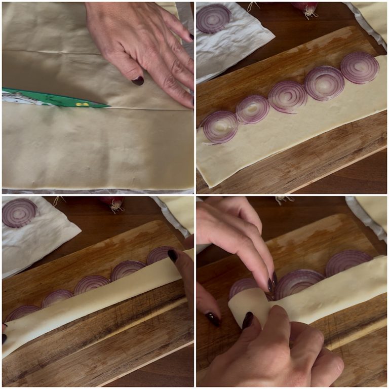 Prepararle è davvero semplice! Basta stendere la sfoglia rettangolare e tagliarla in rettangoli più piccoli, disporre sopra le fettine di cipolla e arrotolare la striscia formando una piccola rosa. Poi si cuoce tutto in forno per circa 20-25 minuti, fino a quando le rose diventano gonfie e dorate.