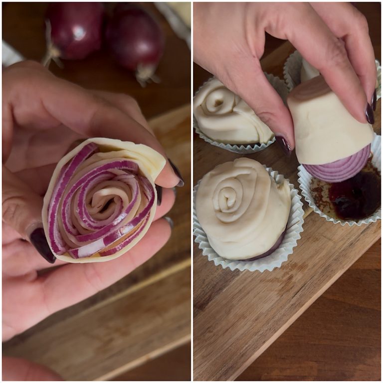 La pasta sfoglia è la base perfetta per realizzare questi bocconcini scenografici: leggera, friabile e versatile, si sposa meravigliosamente con la dolcezza delle cipolle cotte lentamente fino a diventare tenere e caramellate. Il risultato? Un equilibrio perfetto tra croccantezza e morbidezza, tra note dolci e sapide, che rende queste rose un antipasto elegante ma facilissimo da realizzare.
